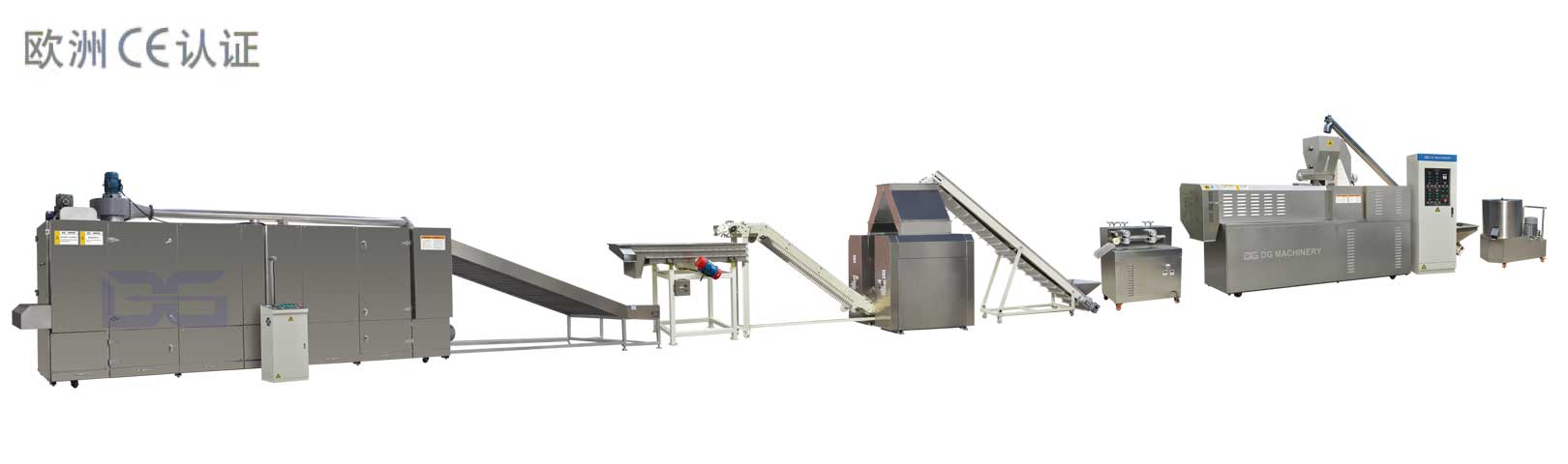 該生產線以面粉、淀粉為原料,經雙螺桿擠壓膨化機擠出膨化坯料,再打糠、篩選生產針糠、雪花糠,也可擠出旋切生產片狀、球形糠,此擠出法生產改變了傳統面包糠的生產工藝,原料混合、熟化、打糠、篩糠均流水線生產,生產效率高、無廢料、原料產品多樣,有日式長針狀糠、美式顆粒糠、雪花糠、片狀糠、球形糠等。“面包糠”是一種廣泛使用的食品添加輔料,用于炸制洋蔥圈、西餐牛排、炸雞腿等。