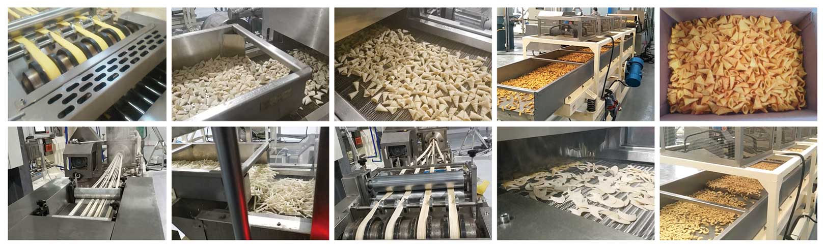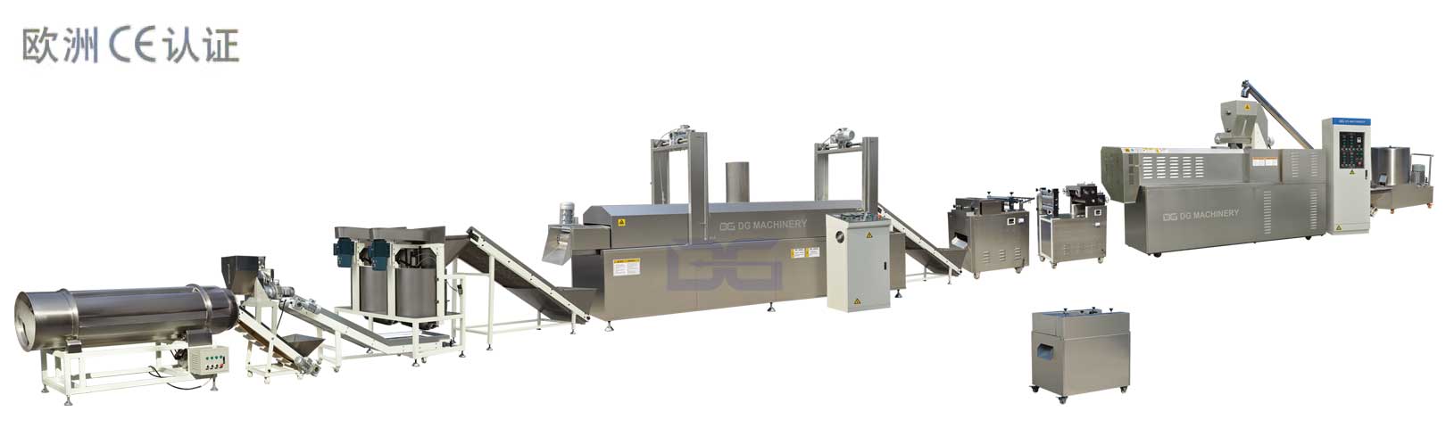 該生產線是傳統手工面食的機械化生產,不僅保留了手工面食制品脆而不膩的良好口感,更實現了原料、造型的無限創新;一臺雙螺桿擠出機即可完成混合揉練、蒸煮熟化、擠出成型的過程。配套沙拉切斷機、油炸機,可生產沙拉片條、鍋巴等2D油炸面食產品;配套壓花機、復合成型機、油炸機,可生產妙脆角、枕包、金魚等3D造型的油炸面食產品。