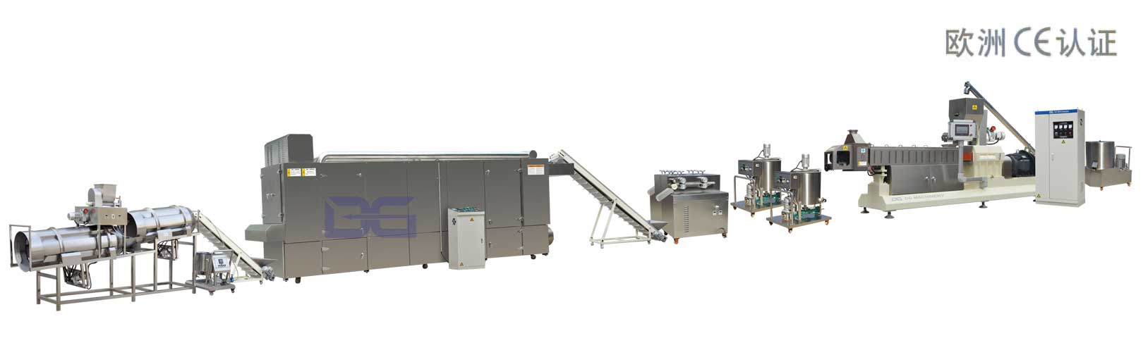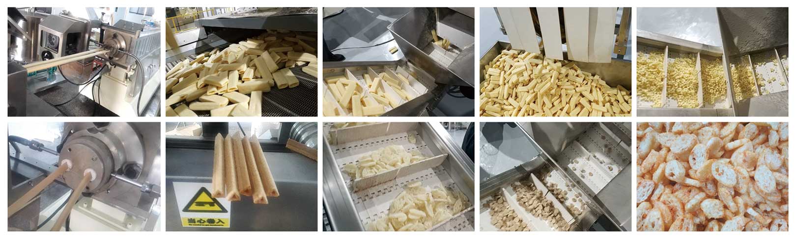 該生產線以玉米粉、大米粉、面粉等為主要原料,經雙螺桿擠壓膨化機擠出空心卷、餅的同時,注餡機將奶油、巧克力、花生醬等不同口味的餡料注入其中,實現共擠出,從而賦予了膨化食品更豐富的口味;擠出的夾心卷餅即可滾切、也可直切,可敞口、也可封口;喂料、擠壓膨化、注餡、成型、烘烤、噴涂均流水線生產;可變換模具和成型機生產醬油餅及仙貝,還可變換模具生產各種形狀的膨化休閑小食品。